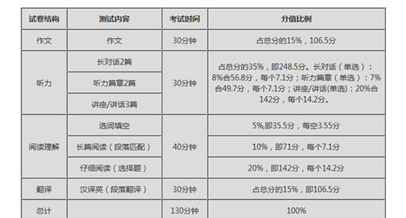 1. 听力分配:听力是六级考试的第一部分。听力分配通常占考试总分的20%。这一部分考察学生通过听取英语对话和短文的能力,理解对话的主旨和关键信息。