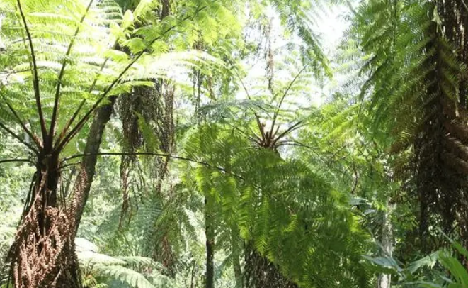 3.苏铁(学名:Cyathea):苏铁是一种蕨类植物,也被称为“恐龙植物”。苏铁起源于距今3亿年前的古生代晚期,是生长在热带和亚热带地区的大型蕨类植物。苏铁的茎可以长达数米,叶片呈羽状,边缘有锯齿状。苏铁的孢子囊群位于叶片的背面,类似于别的蕨类植物。苏铁喜欢湿润的环境,常生长在山坡、溪谷等处。苏铁在地质历史上的分布广泛,是一种重要的化石植物。